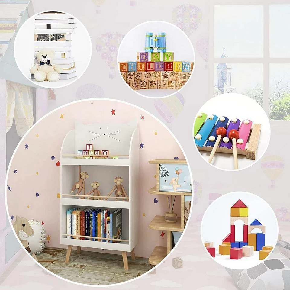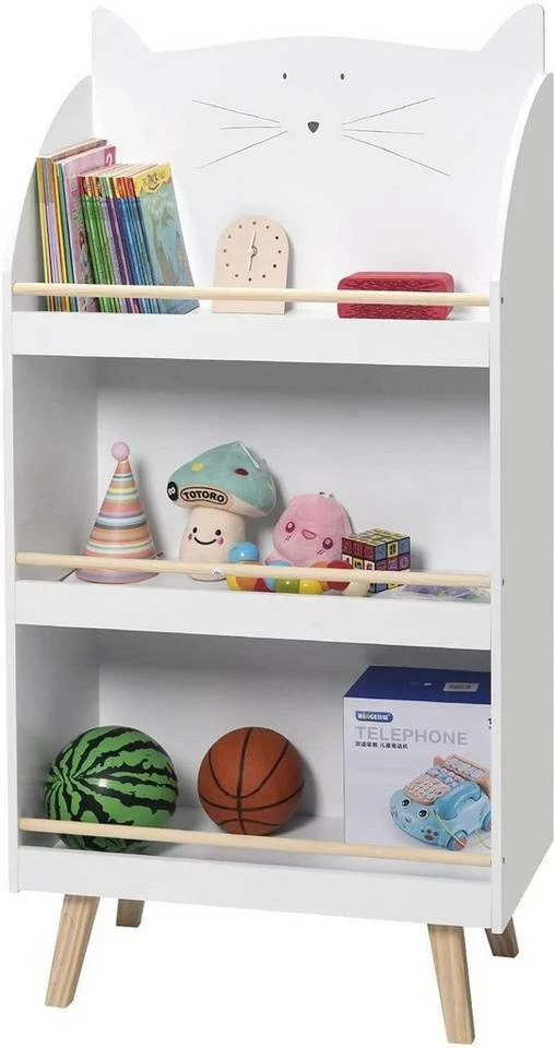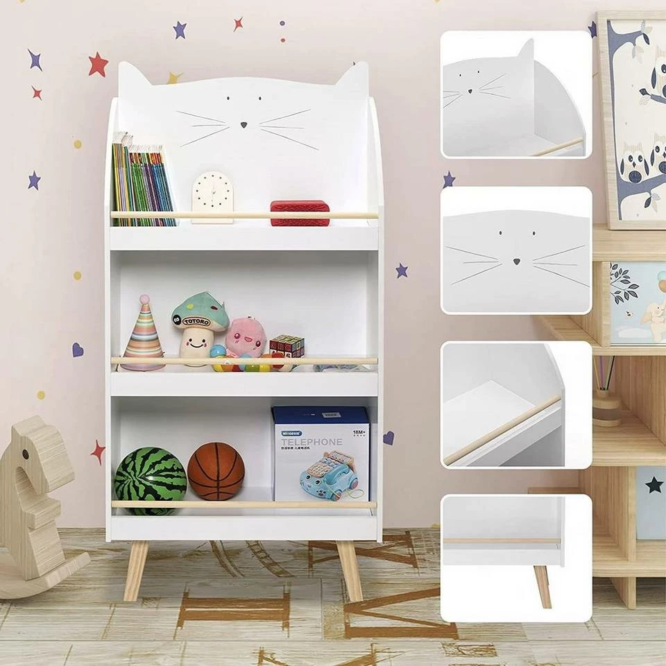 - Die niedliche Katzenform wird von Kindern geliebt. Das weiße Spielzeugregal mit der holzfarbenen Leiste hat einen schlichten und modernen Stil.