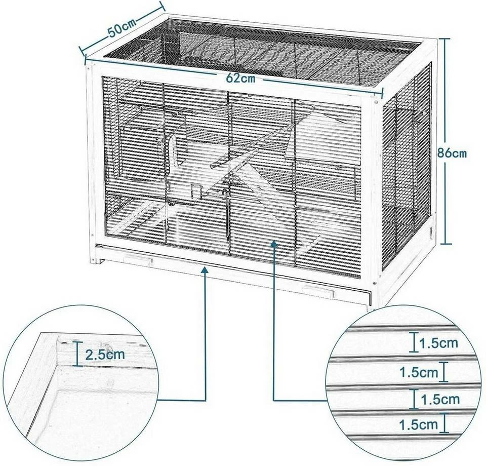 - Aufklappbarer Deckel zur Belüftung: Der obere Drahtgitterdeckel kann geöffnet werden, um eine Luftzirkulation zu gewährleisten. Dank der Unterstützung durch eine Holzstange können Sie Ihr Haustier und die darin befindlichen Gegenstände leicht greifen und erreichen.
