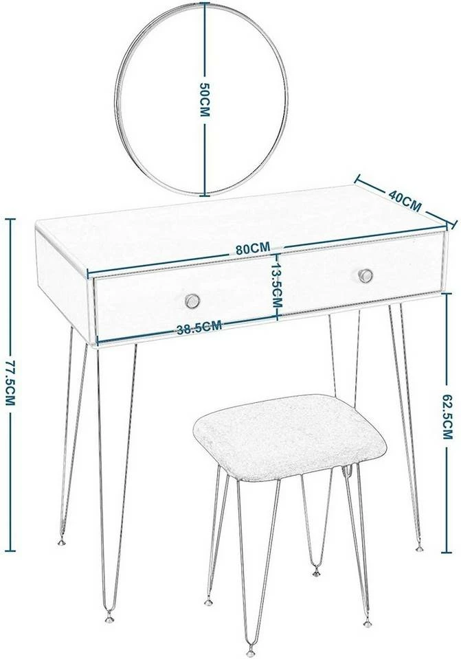 - Lieferumfang: 1 Schminktisch mit Spiegel+1 Schminkhocker+1 Aufbauanleitung
