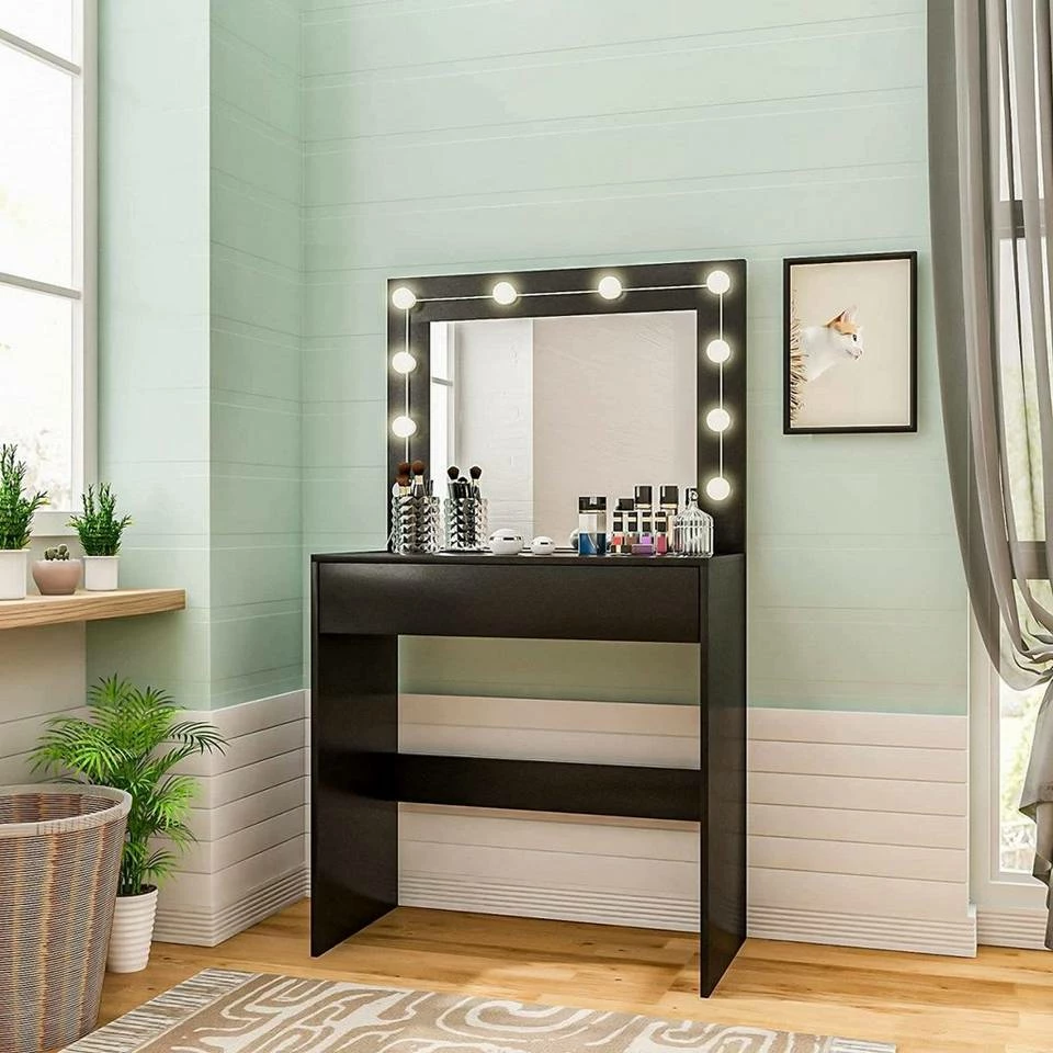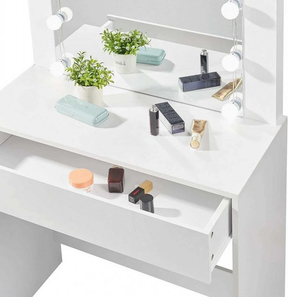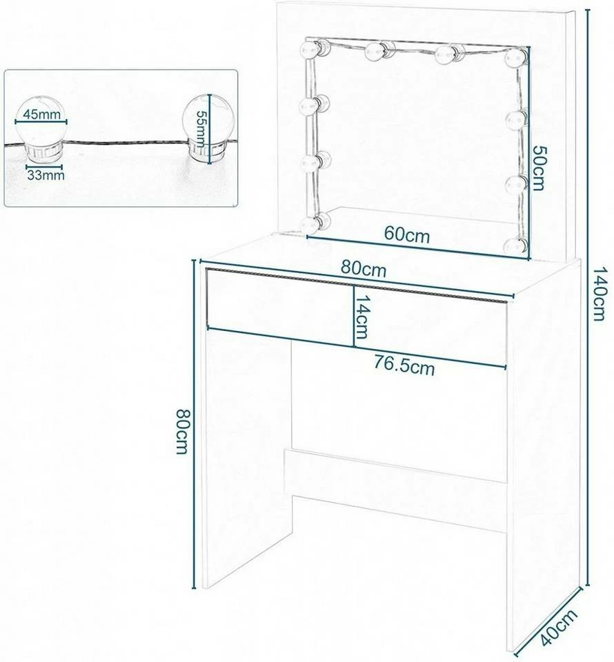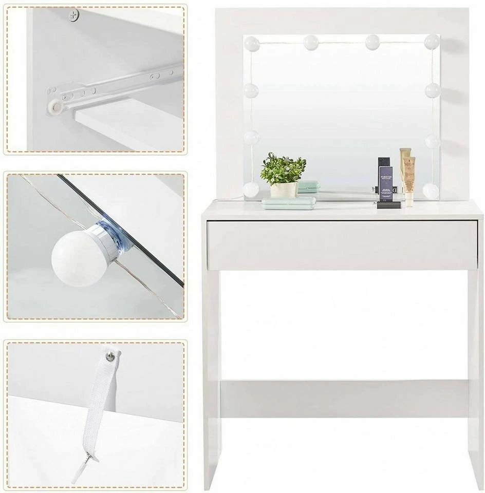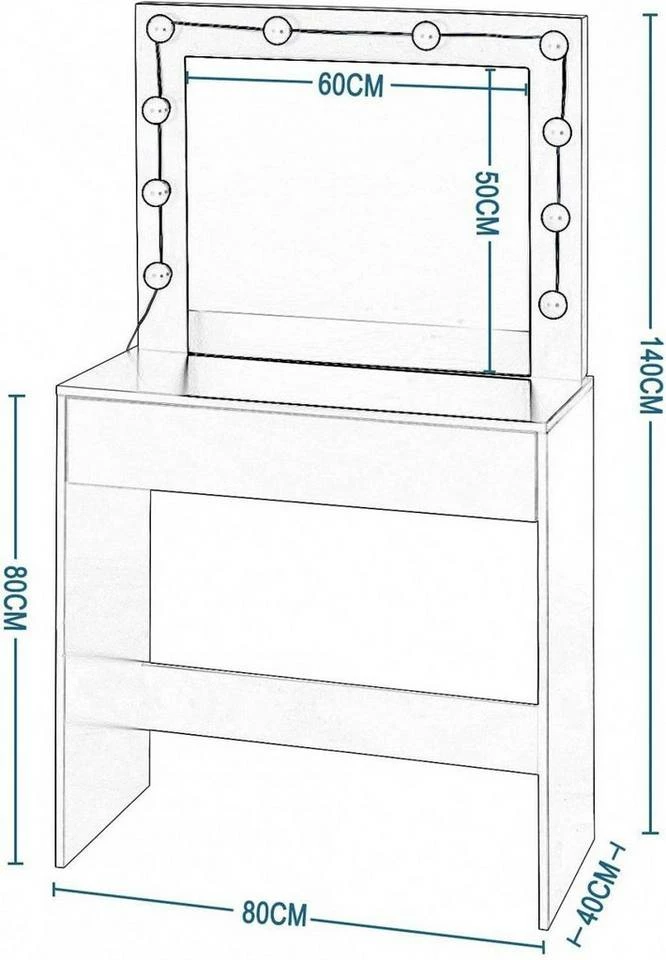 - Lieferumfang: 1 x Schminktisch,1 x Spiegel, 10 x LED Lichte, 1 x Aufbauanleitung