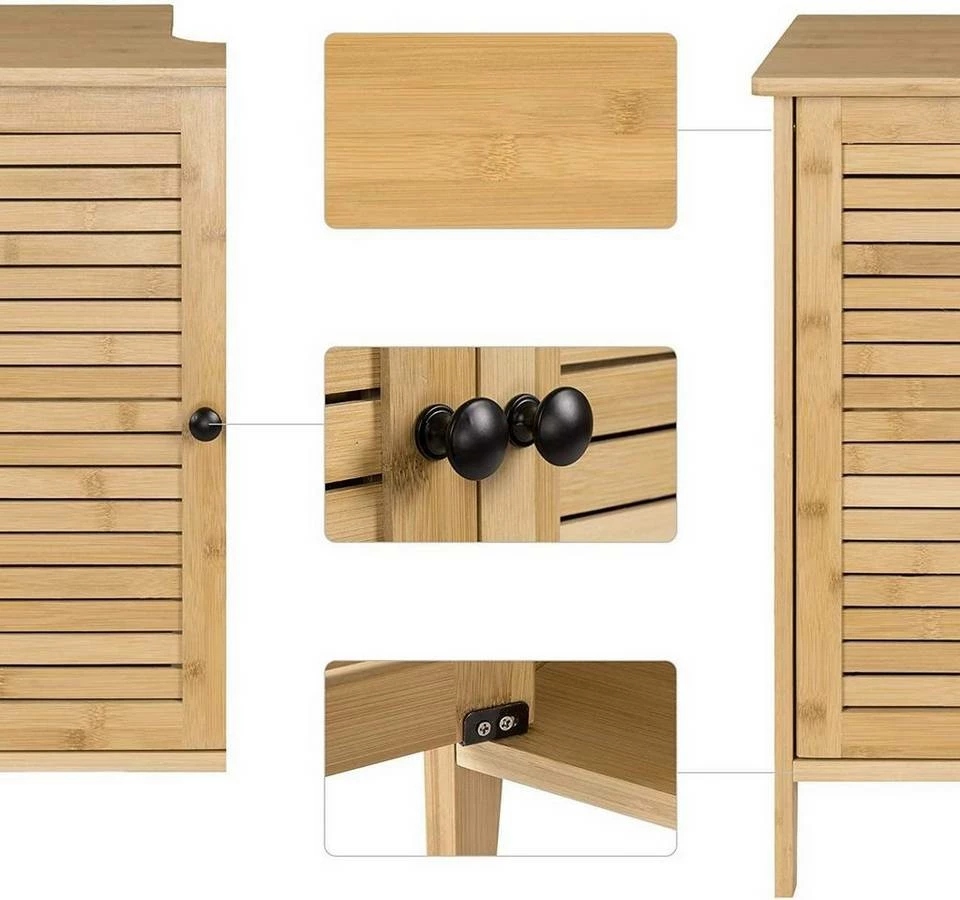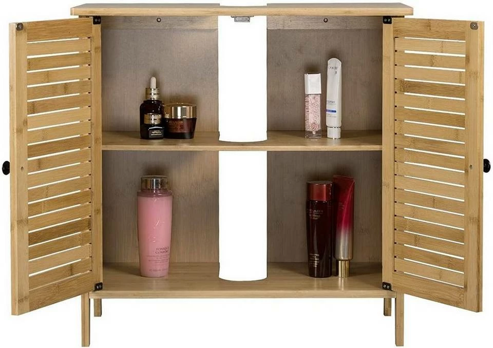 - Der Waschbeckenunterschrank aus Bambus mit modernem Design und im Landhausstil mit viel Platz für Badeuntensilien
